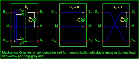The simple circuit in Figure 3, “ 4-bit Gray-coded adjustable load ” implements this idea. It can be seen as a combined Gray-to-binary-to-analog converter with resistive output. Incidentally, the light bulbs display the value converted to binary.