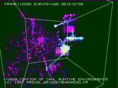 The images and animation below are 3D renderings of the runtime environment of ML programs (Objective Caml v1.05). Linked lists are easily recognizable; if you think you can see balanced binary trees and hashtables then you should probably logout and take a break.